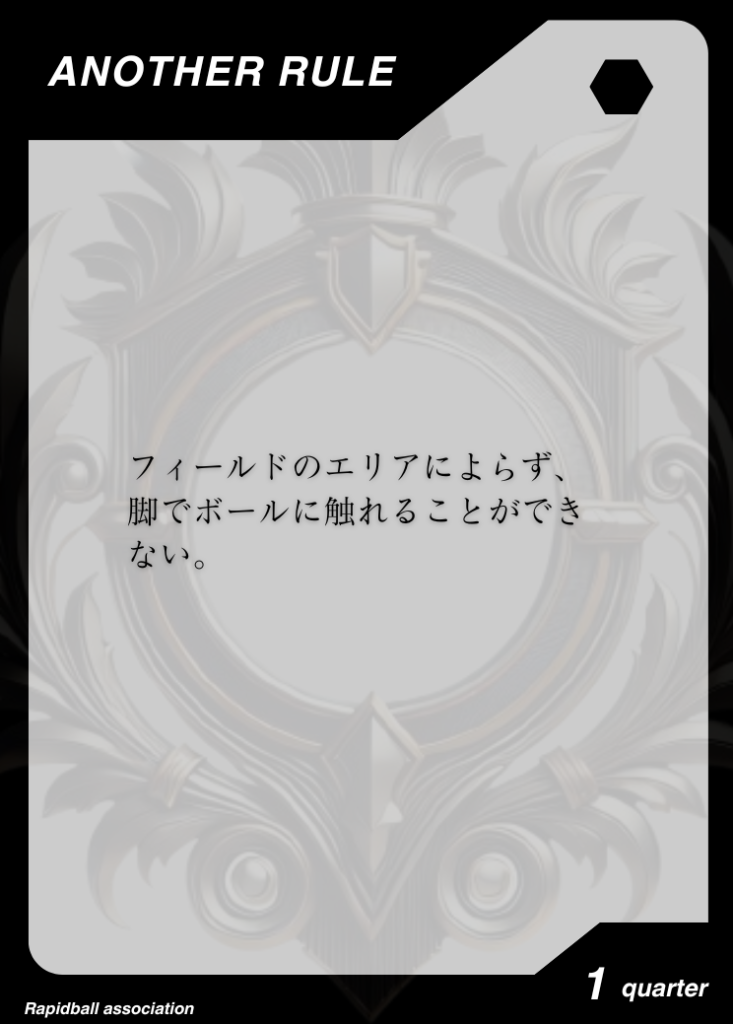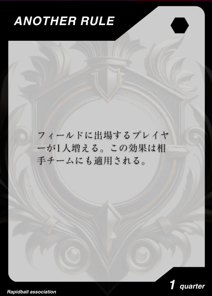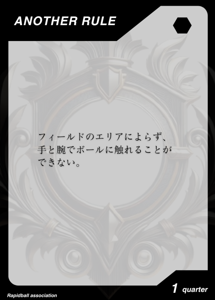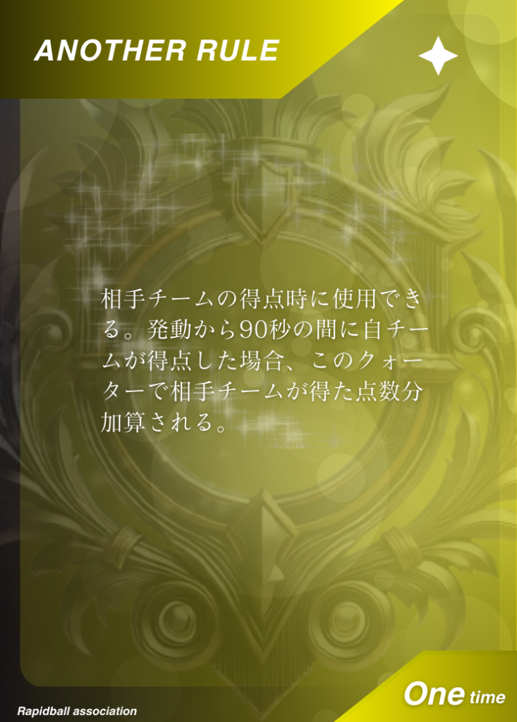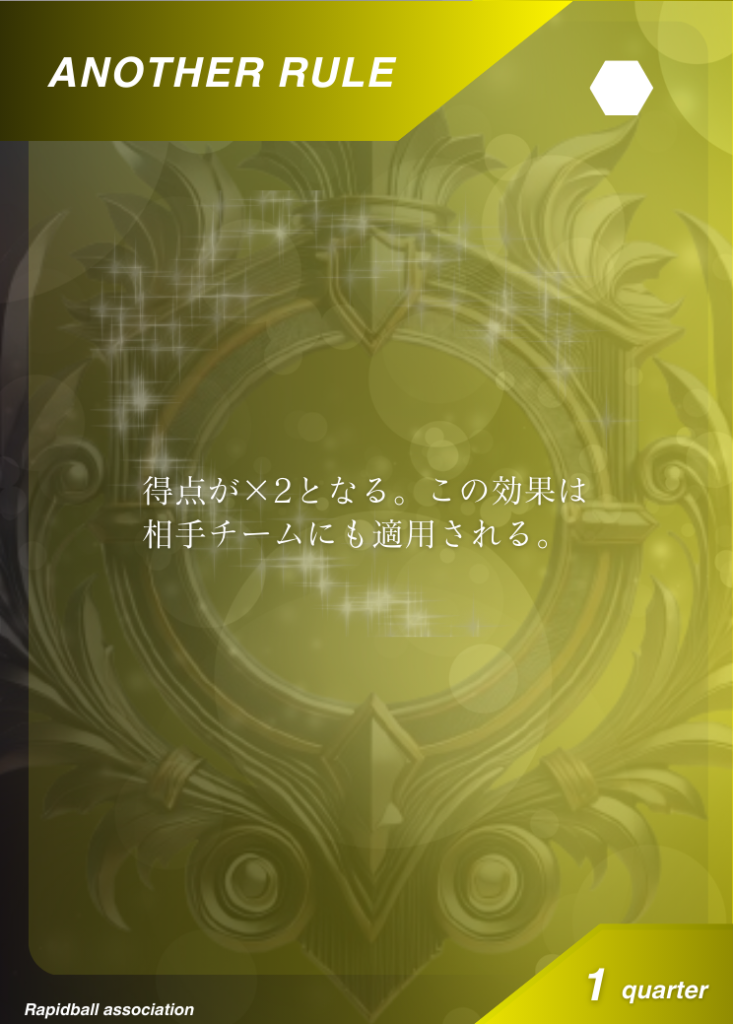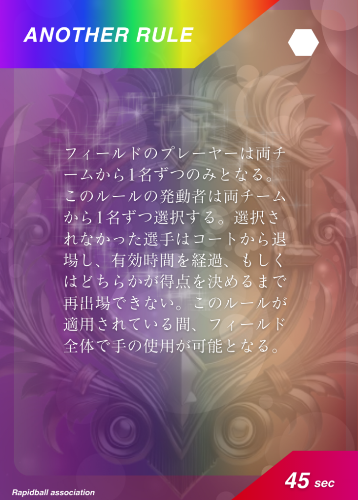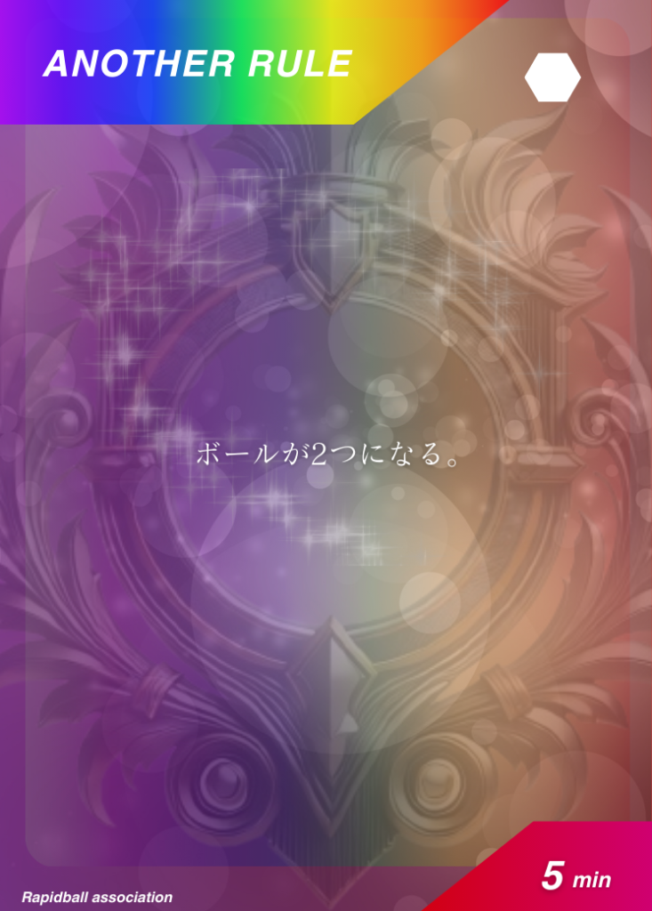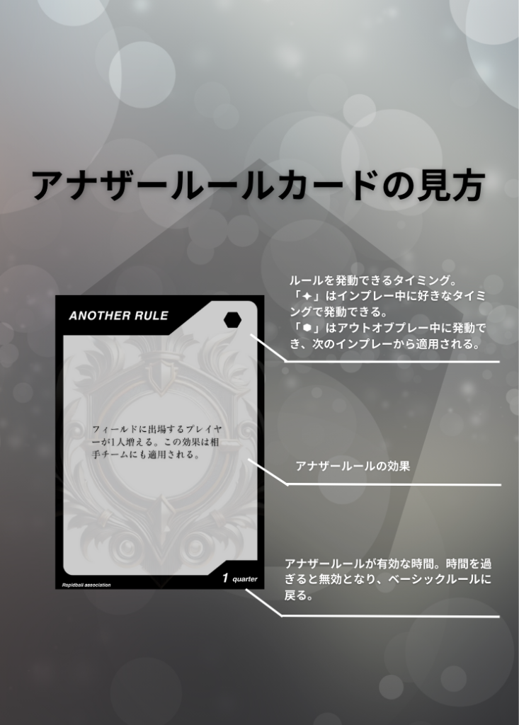 アナザールール アナザールールは、ラピッドボールの通常ルールに追加して遊べるルールです。 アナザールールには「効果」「発動タイミング」「有効時間」が決められており、各チーム2つまで試合で使うことができます。 試合開始10分前までに、どのルールを試合に持ち込むかを審判と相手チームに開示する必要があります。 アナザールールでラピッドボールはもっとたのしくなる! オフィシャルアナザールールカード 共有: X で共有 (新しいウィンドウで開きます) X Facebook で共有 (新しいウィンドウで開きます) Facebook 友達にメールでリンクを送信 (新しいウィンドウで開きます) メールアドレス