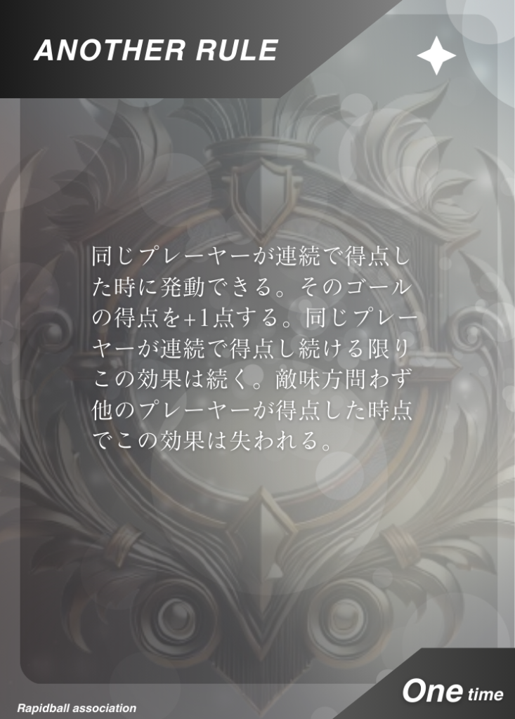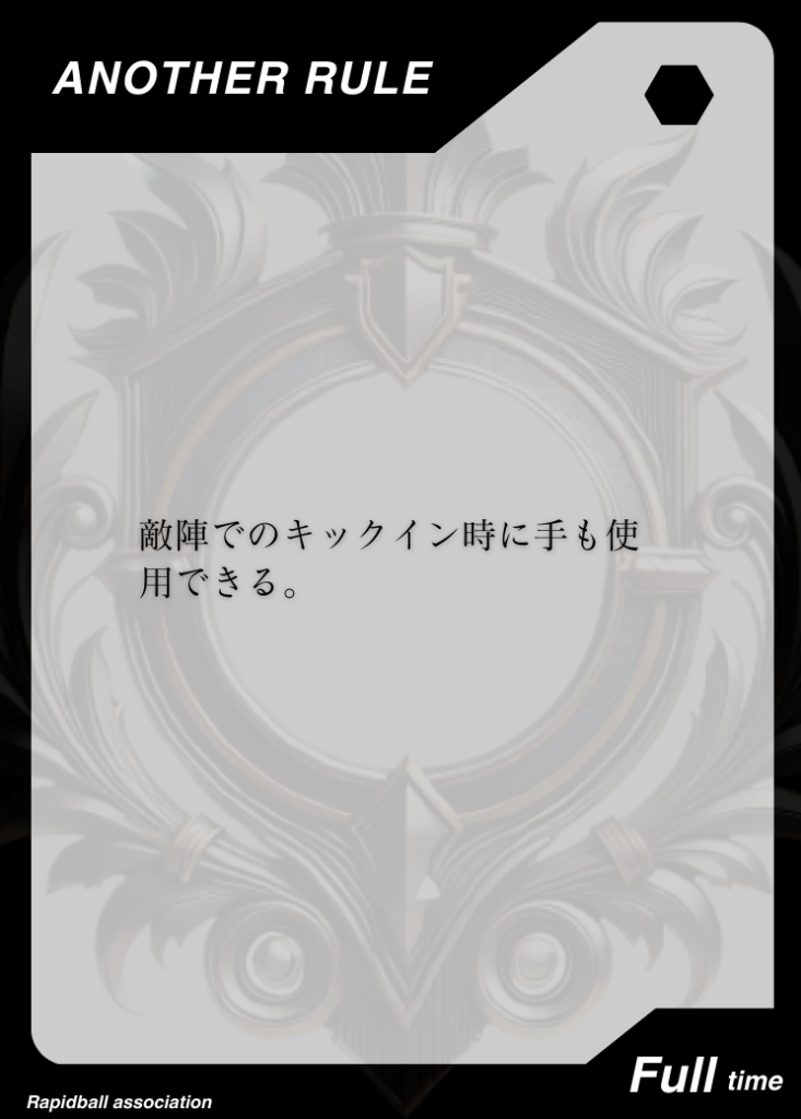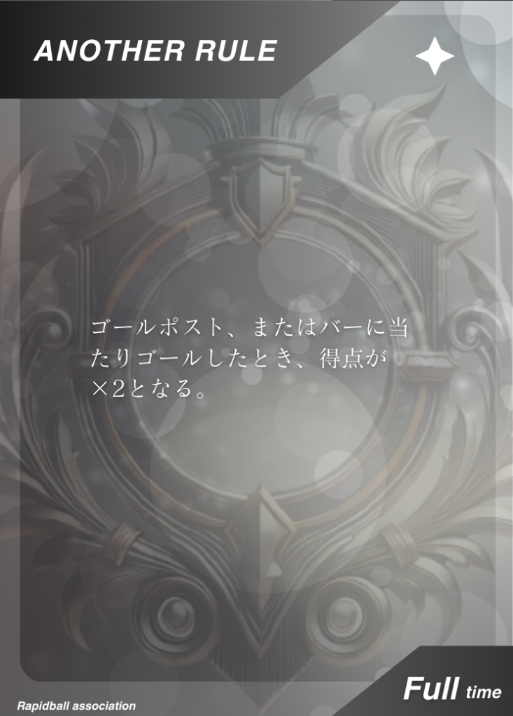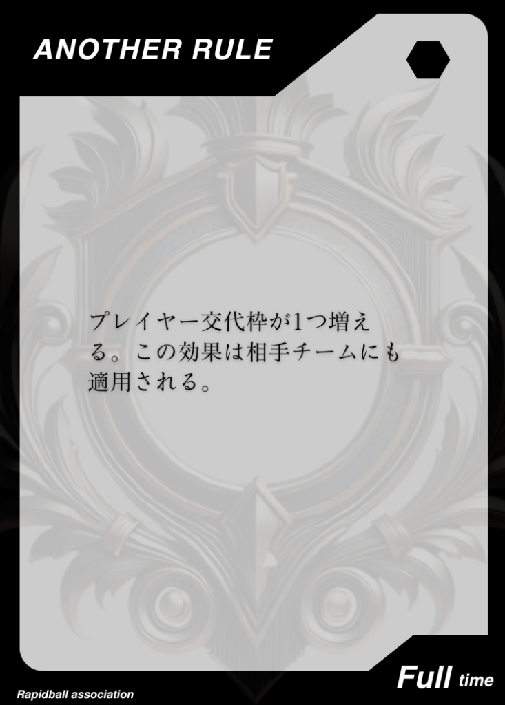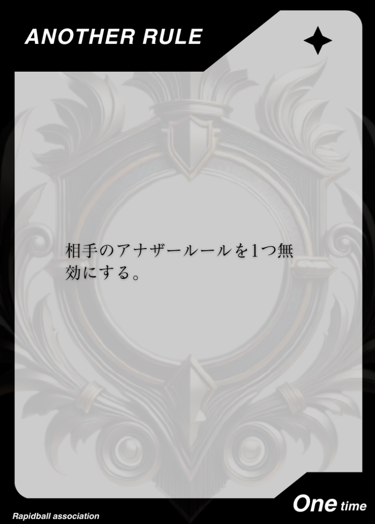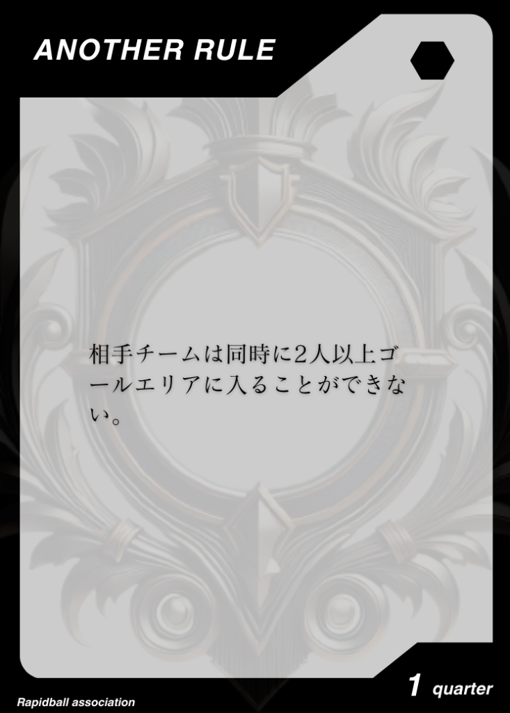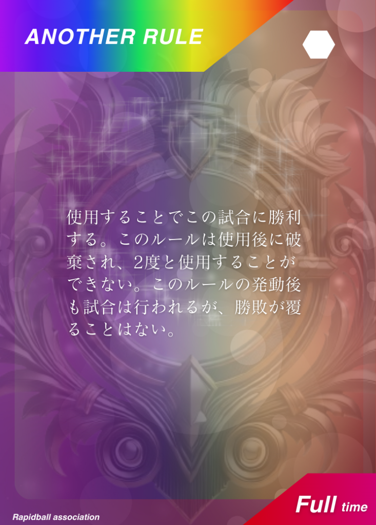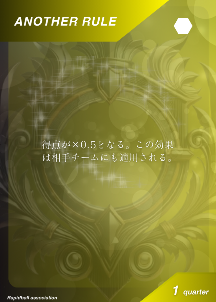 アナザールール アナザールールは、ラピッドボールの通常ルールに追加して遊べるルールです。 アナザールールには「効果」「発動タイミング」「有効時間」が決められており、各チーム2つまで試合で使うことができます。 試合開始10分前までに、どのルールを試合に持ち込むかを審判と相手チームに開示する必要があります。 アナザールールでラピッドボールはもっとたのしくなる! オフィシャルアナザールールカード 共有: X で共有 (新しいウィンドウで開きます) X Facebook で共有 (新しいウィンドウで開きます) Facebook 友達にメールでリンクを送信 (新しいウィンドウで開きます) メールアドレス